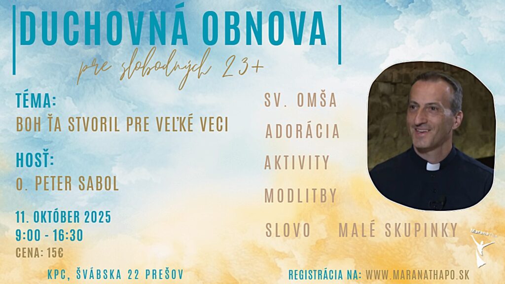 Milovaní, pozývame vás na duchovnú obnovu, ktorá sa uskutoční 11.10.2025 v KPC Jána Pavla II. v sobotu od 9:00 do cca 16:30 hod.